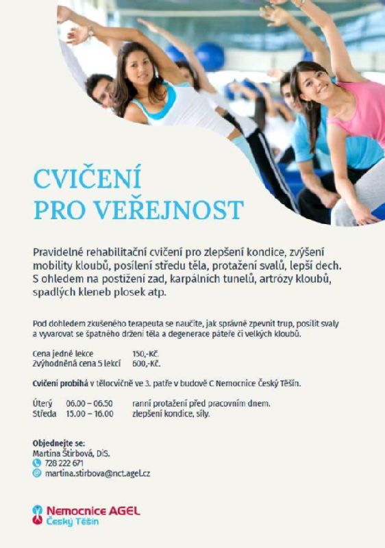 Zájemci o skupinové cvičení v Nemocnici AGEL Český Těšín se mohou přihlásit telefonicky na čísle 728 222 671. Aktuální rozvrh lekcí a další informace jsou k dispozici na webových stránkách a Facebooku nemocnice.